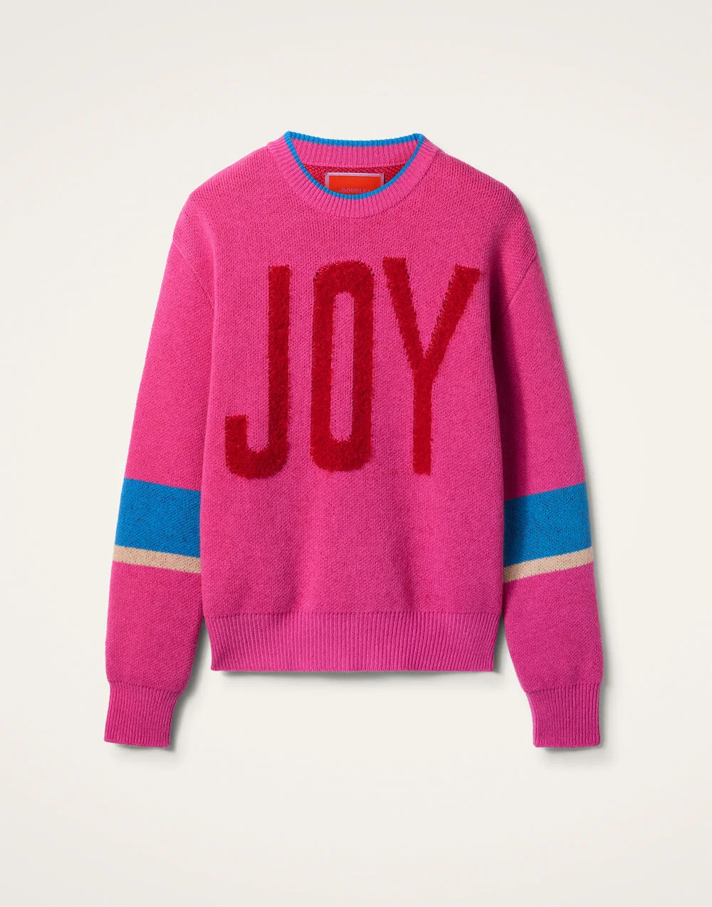 Oversized and snuggly as all get-out, this solid jumper arrives with our vibration-raising message of "JOY" woven across it using an intricate Intarsia technique. With a contrast color collar and stripes on the sleeves, it's got a vintage varsity vibe with our signature modern twist. Details & Fit - Oversized solid jumper - Intarsia writing across chest - Contrast color collar - contrast stripes on sleeves - Made in Italy - Composition: 65% Wool 18% Mohair 11% polyamide 6% Cashmere - The model is 180 cm / 5′ 11″ tall and wears a size S