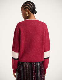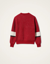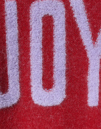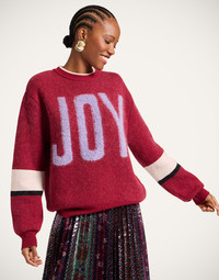 Oversized and snuggly as all get-out, this solid jumper arrives with our vibration-raising message of "JOY" woven across it using an intricate Intarsia technique. With a contrast color collar and stripes on the sleeves, it's got a vintage varsity vibe with our signature modern twist. Oh yeah, and it's cashmere.... Details & Fit - Oversized solid jumper - Intarsia writing across chest - Contrast color collar - contrast stripes on sleeves - Made in Italy - Composition: 65% Wool 18% Mohair 11% polyamide 6% Cashmere