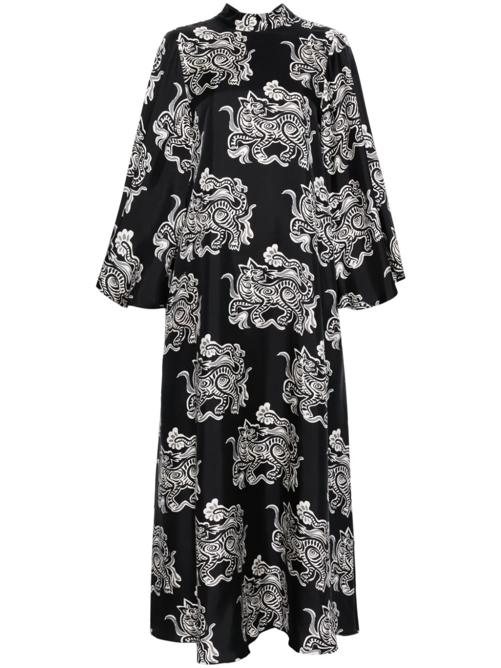 Magnifico maxi dress Highlights - Black - Rear tie fastening - Mock neck - Long wide sleeves - Two side slit pockets Made in Italy Composition Silk 100% SIZE & FIT Model measurements Height 5 ft 10 in(1.77 m) Bust/Chest 34.64 in(88 cm) Hips 35.43 in(90 cm) Waist 24.8 in(63 cm) FittingInformation Designed to be unstructured, offering a loose fit throughout Made from a lightweight non-stretch fabric