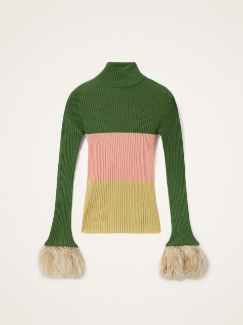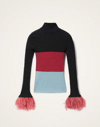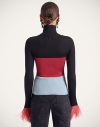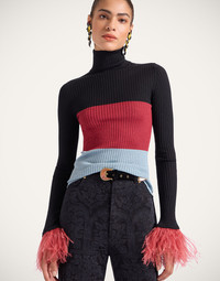 In true Italian style, we like to add a little extra joy jolt to all the clothes we create - here, we’ve taken a classic turtleneck shape and woven it in a sumptuous silk-cashmere colorblock, before trimming each cuff with a plume of feathers. Slim through the chest and shoulders and wide along the base to create an hourglass shape, this is a super flattering wardrobe staple, fabulous alone but extra elegant under a 24/7 Jacket with just the feathers peeking through. Consider it a happy high-kick to the heart. Details & Fit - Silk-cashmere blend - High neck - Slim through shoulders - Wide at hem - Feathers around entire cuff - Ribbed body - 100% Made in Italy - Composition: 70% Cashmere 27% Silk 3% Ostrich Feathers - Garment length: 60cm - The model is 176 cm / 5′ 9″ tall and wears a size S