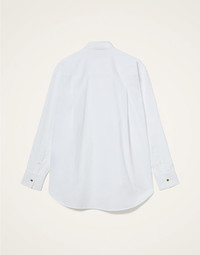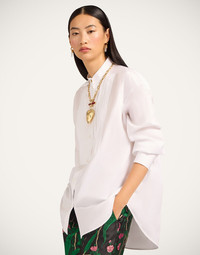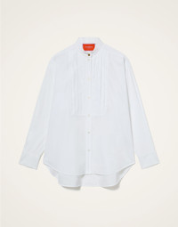 We took our sophizticated Peggy Shirt inspired by the iconic collector Ms. Guggenheim and oversized it for even more artistic flair. A take on a Tuxedo Shirt, we’ve added a boxy drop shoulder to this classic silhouette, and a high low hem for a more modern mood. Minimalists will love the two tone version, while those seeking a pop of punchy print can opt for the version with our playful geometric panel. Details & Fit - Cotton - Oversized Tuxedo Shirt - Boxy Drop Shoulder - Contrast plastron with pleats - High-low hem - 100% Made in Italy - Composition: 100% cotton - The model is 177 cm / 5′ 9.7″ tall and wears a size S