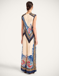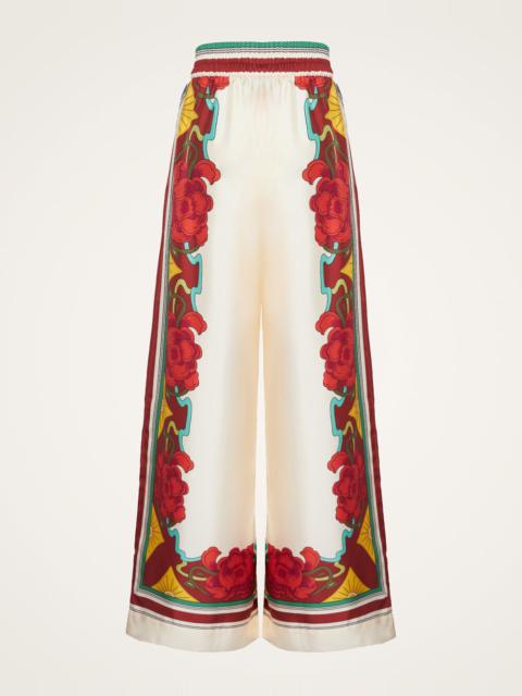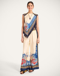 We cannot take credit for inventing the Palazzo Pant silhouette, but we will take credit for making them cool again. These trousers sit on the waist and fall flared, with a wide, breezy fit through the legs – like a skirt, but with the comfort of pants. With a woven texture and a lustrous hint of shine, they're crafted in fluid silk twill from Lake Como and are prime for your most elegant outings in our new Lemuria print placed perfectly by hand. Details & Fit - Silk twill from Lake Como - Placed print - Elasticated waist - Concealed side pockets - Wide cut - Made in Italy - Composition: 100% Silk - Garment length: 110cm - The model is 177 cm tall and wears a size S