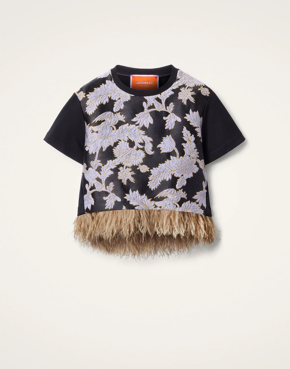 How to add a little drama to the everyday? Allow our La Scala T-shirt to take to the stage. This beauty follows its predecessors with a fabulous contrast ostrich feather trim. We’ve balanced it out with a cool, cropped T-shirt silhouette in our romantic devore velvet which means it's as great for a sassy high-low city look as it is for something more special. Structured not weighty, boyish and boxy, it’s super pretty with our A-Long Skirt or go full-on maximalist with the matching Saturday Night Pants. Details & Fit - Jacquard - Round neck - Cropped silhouette - Ostrich feather trim - 100% Made in Italy - Composition: 42% Polyester 22% Wool 22% Acrylic 8% Other Fibers 6% Silk - The model is 178 cm / 5′ 10″ tall and wears a size S
