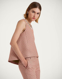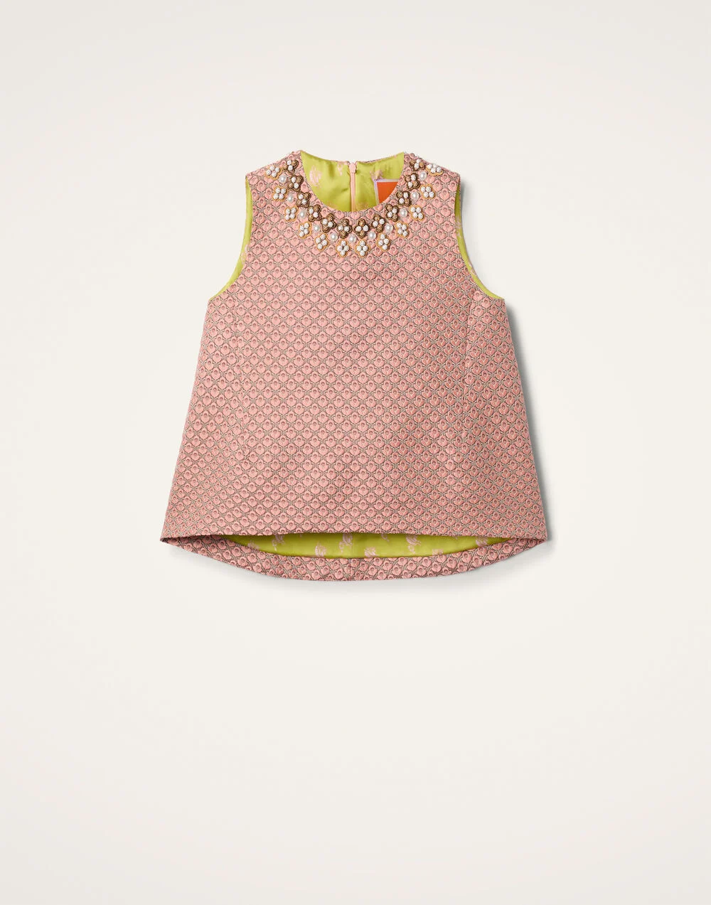 Our La Scala Top, inspired by the iconic opera house here in Milan, was such a hit, we decided to inject it with as much opulence as befits the name. Arriving in our Tulip Jacquard, we’ve added a bountiful bejewelled collar. With her all-figure-flattering trapeze shape and structured fit, she pairs perfectly with one of our Pencil Skirts our under an equally dramatic dinner jacket. Details & Fit - Jacquard top - Embellished collar - Trapeze shape - 100% made in Italy - Composition: 76%Polyester 24%Polyamide - The model is 181 cm / 5′ 11.3″ tall and wears a size S