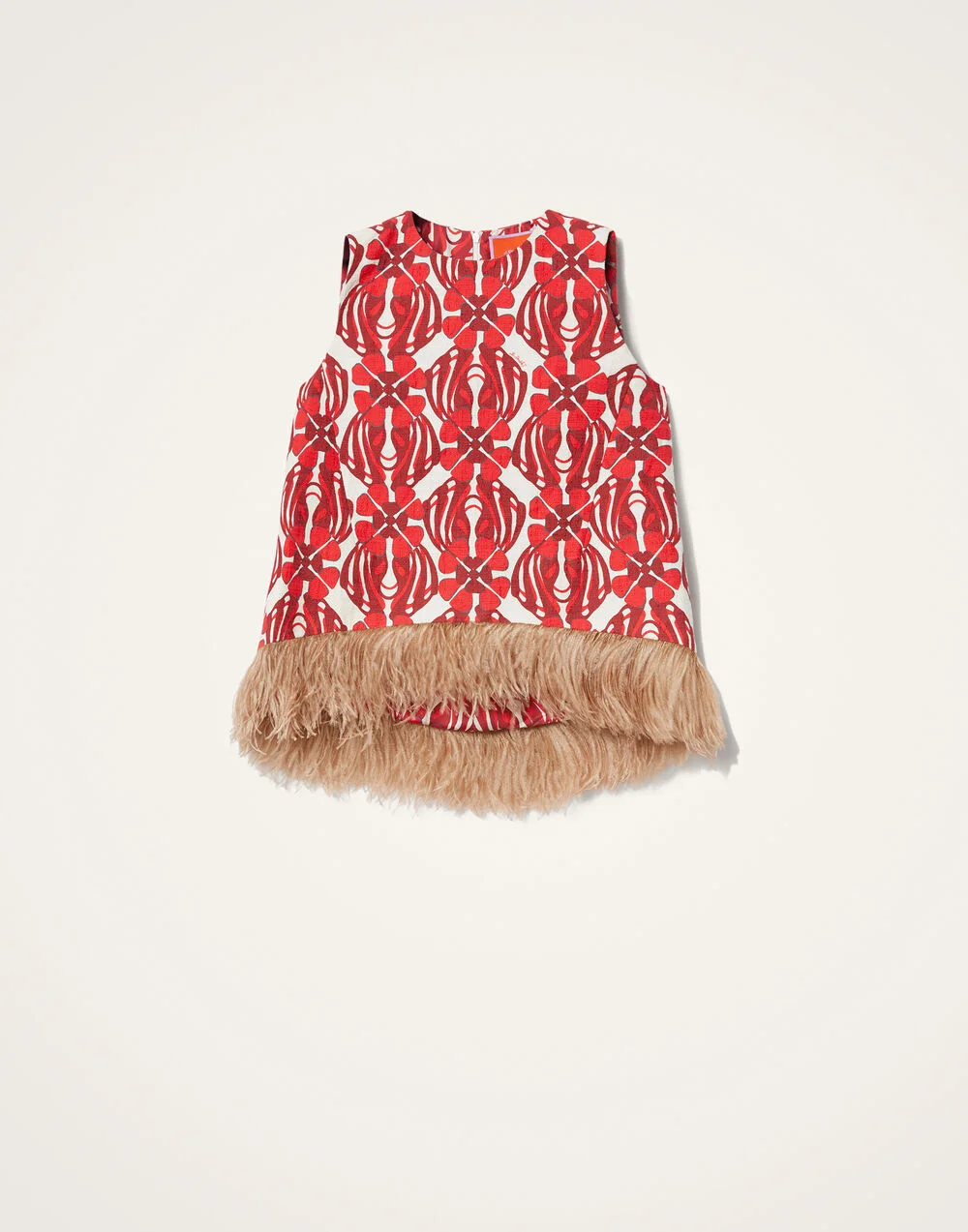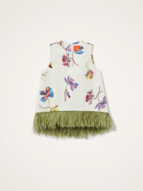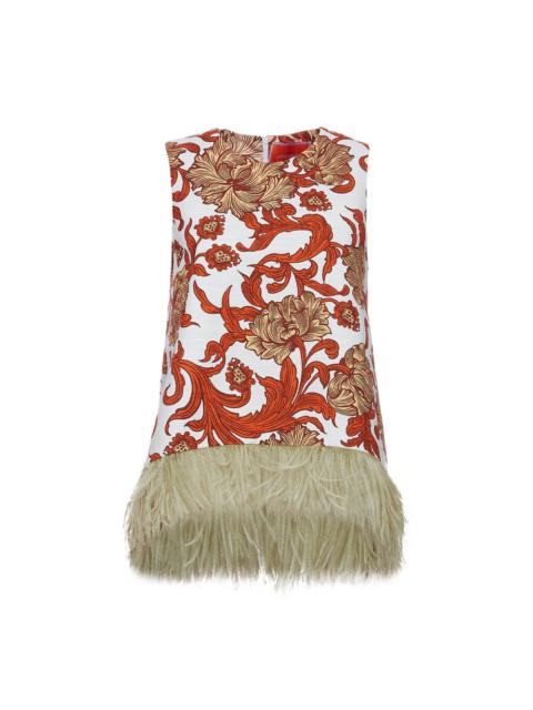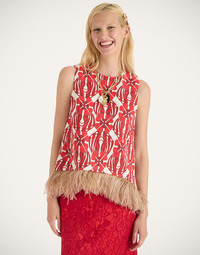 As far as interesting silhouettes go; this top may win the gold star. The asymmetrical hem, trapeze silhouette and marabou feather trim creates an alluring form. In shot cotton which has a textured surface feel, it’s undoubtedly upscale but looks equally as great with some jeans and flats. Details & Fit - Shot cotton - Unlined - Sleeveless top - Ostrich feathers on bottom hem - Composition: 98% Cotton, 2% Elastane - The model is 178 cm / 5′ 10″ tall and wears a size S