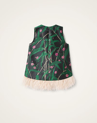 As far as interesting silhouettes go, this top may win the gold star. The asymmetrical hem, trapeze silhouette and marabou feather trim creates an alluring form, while our Bamboo jacquard is woven with metallic threads for a truly glowing finish. This beauty is undoubtedly upscale but looks equally as great with some jeans and flats. Details & Fit - Jacquard - Unlined - Sleeveless top - Ostrich feather trim - Composition: 50% Polyester 25% Silk 19% Viscose 5% Metal Polyester - The model is 180 cm / 5′ 11″ tall and wears a size S