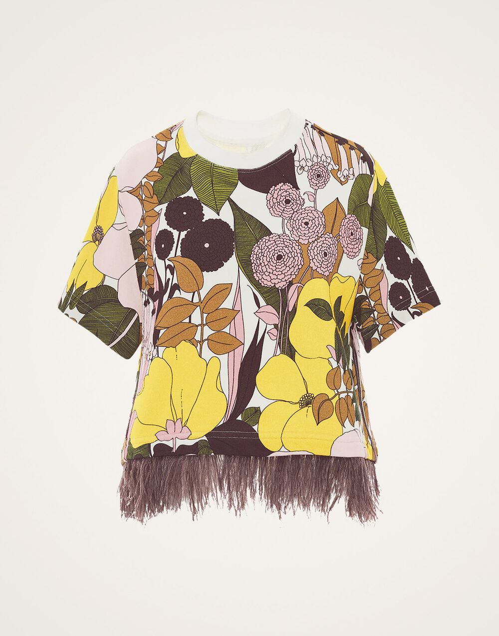How to add a little drama to the everyday? Allow our La Scala T-shirt to take to the stage. This beauty follows its predecessors with a fabulous contrast ostrich feather trim. We’ve balanced it out with a cool, cropped T-shirt silhouette in our thick cotton jersey which means it's as great for a sassy high-low city look as it is for something more special. Structured not weighty, boyish and boxy, it’s super pretty with our A-Long Skirt or go full-on maximalist with the matching Saturday Night Pants. Details & Fit - Jersey gemini - Round neck - Cropped silhouette - Ostrich feather trim - 100% Made in Italy - Composition: 97% Cotton 3% Ostrich Feathers - The model is 178 cm tall and wears a size S - Garment length: 58cm