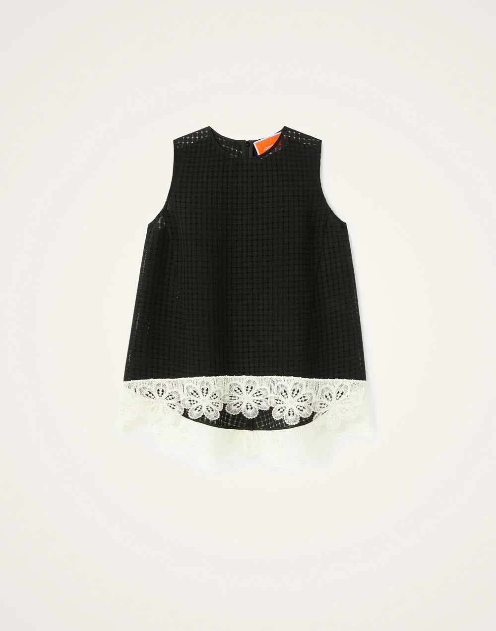 As far as interesting silhouettes go, this top may win the gold star. The asymmetrical hem, trapeze silhouette and contrast trim creates an alluring form. We love the drama of this black Cordonetto version exquisitely finished with lace, ready to beguile whether you style it with jeans and trainers for after dark drinks or crisp black pants for somewhere fancier. Details & Fit - Cordonetto - Unlined - Sleeveless top - Lace trim - Composition: 100% Cotton - The model is 178 cm / 5′ 10″ tall and wears a size S