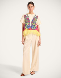 Our favorite high-low tee reimagined in light but structured double jersey to exude dreamy vacation ease wherever you are in the world. With detailed finishing, it features a cool, cropped T-shirt silhouette that leans into a boxy, boyish vibe and a fabulously feathered hem. Belissima and breezy with the matching Loose Pants or weekend-ready worn with your favorite jeans. Details & Fit - Jersey with feathers - Round neck - Cropped silhouette - 100% Made in Italy - Garment length: 50cm - Composition: 98% Cotton 2% Ostrich Feathers - The model is 177 cm tall and wears a size S