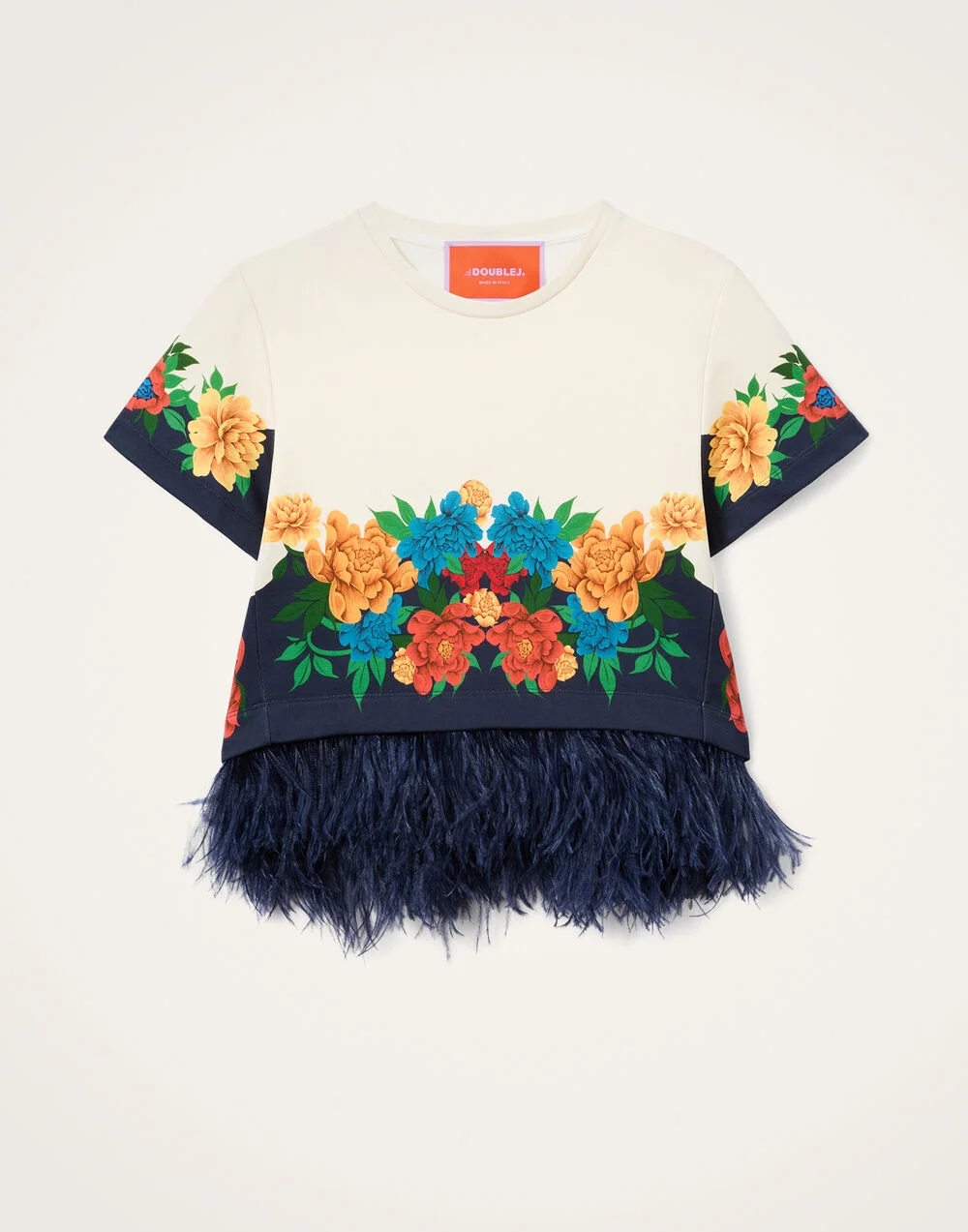 Our everyday drama-rama La Scala Tee is back and even more luxurious for the celebration season ahead. Crafted in our weighty and smooth heavy jersey, it features this blooming peony print exquisitely placed by hand for a truly beautiful finish. With its ostrich feather trim it’s a scene stealing outfit topper - try it with the matching Palazzo pants for a cool wedding guest look, or high waisted denim for just about anywhere else. Details & Fit - Garment fit: regular - Jersey - Cropped silhouette - Ostrich feathers trim - Placed print - 98% Cotton 2% Ostrich feathers - Unlined - Made in Italy - Garment lenth: 50cm - Fitted at the shoulders, over at the waist - The model is 180 cm / 5′ 11″ tall and wears a size S