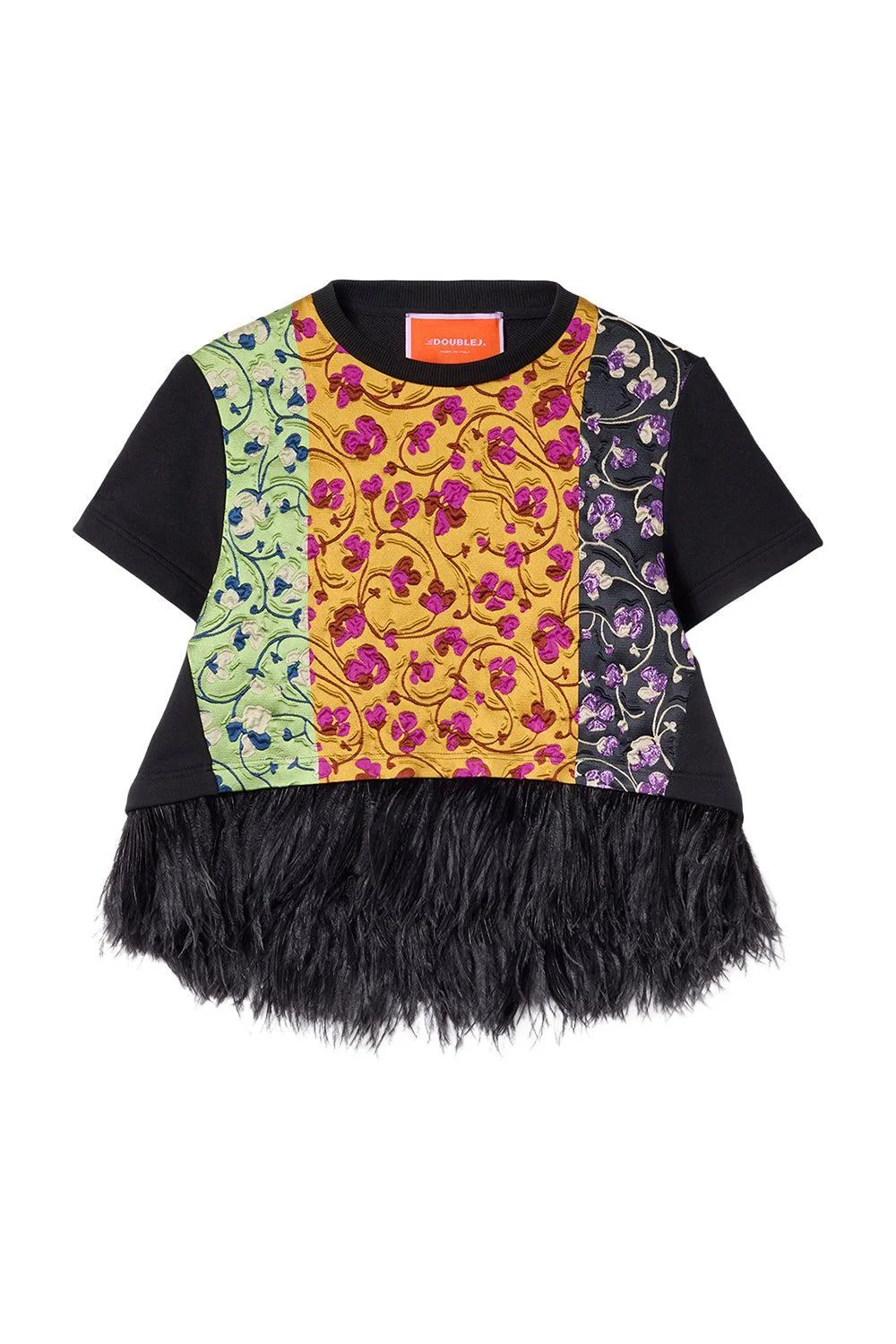 DETAILS AND INSIGHT La Doublej la scala tee - honeysuckle tricolor placee in honeysuckle tricolor jacquard. 88% Polyester 7% Silk 5% Polyamide Dry Clean Made In Italy Ships By Jan 22 Style TSH0041_JCQ129HNY03_YE02