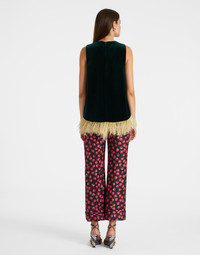 A true trophy top, the La Scala is back and colored happy for the holiday season arriving in exuberant new pink and blue hues. In tactile cotton velvet, it balances a flattering trapeze silhouette with an asymmetric hemline and is finished for a flourish with a flamboyant marabou feather trim. Naturally, maximalists will lean into the drama with one of our contrast print Pencil Skirts, but you’ll find this beauty equally alluring offset with jeans or black pants. Details & Fit - Cotton velvet - Unlined - Asymmetric hemline - Trapeze silhouette - Sleeveless top - Ostrich feathers on bottom hem - Composition: 98%Cotton 2% Ostrich Feathers - The model is 179 cm tall and wears a size S - Garment length: 72cm