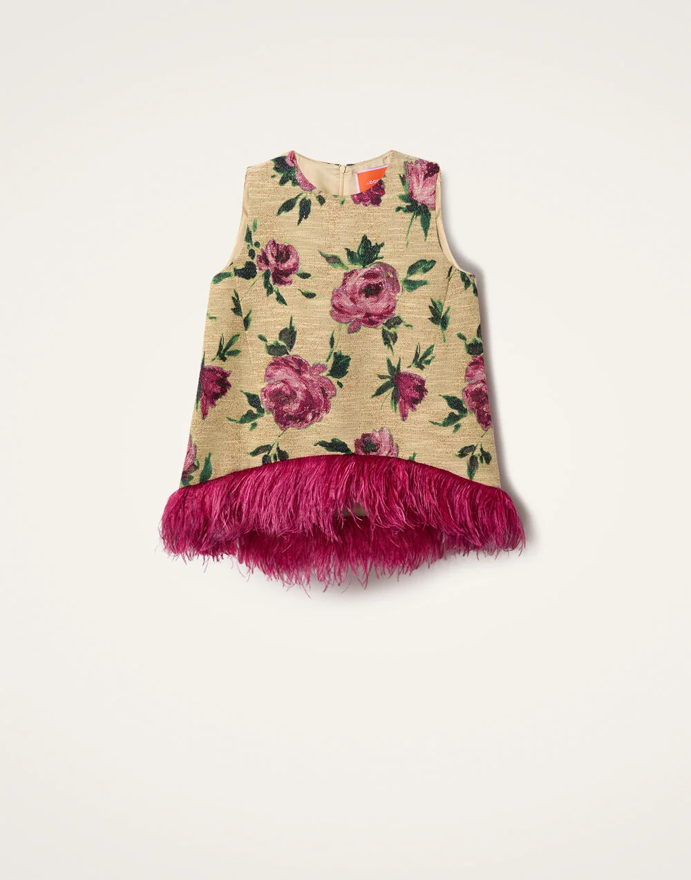 As far as interesting silhouettes go, the La Scala Top may win the gold star. Prime for VIP opera invites, winter cocktails, Milanese coffee runs and beyond, this version arrives in our sumptuous embroidered jacquard with an alluring asymmetrical hem and contrast marabou feather trim. Jeans and ballet pumps girls will find it slips in effortlessly with any denim rotation; maximalist mavens seek out the stunning Hendrix Pants to match. Details & Fit - Tweed - Unlined - Sleeveless top - Ostrich feathers on bottom hem - Composition: 61% Cotton 39% Polyester - The model is 180 cm / 5′ 11″ tall and wears a size S