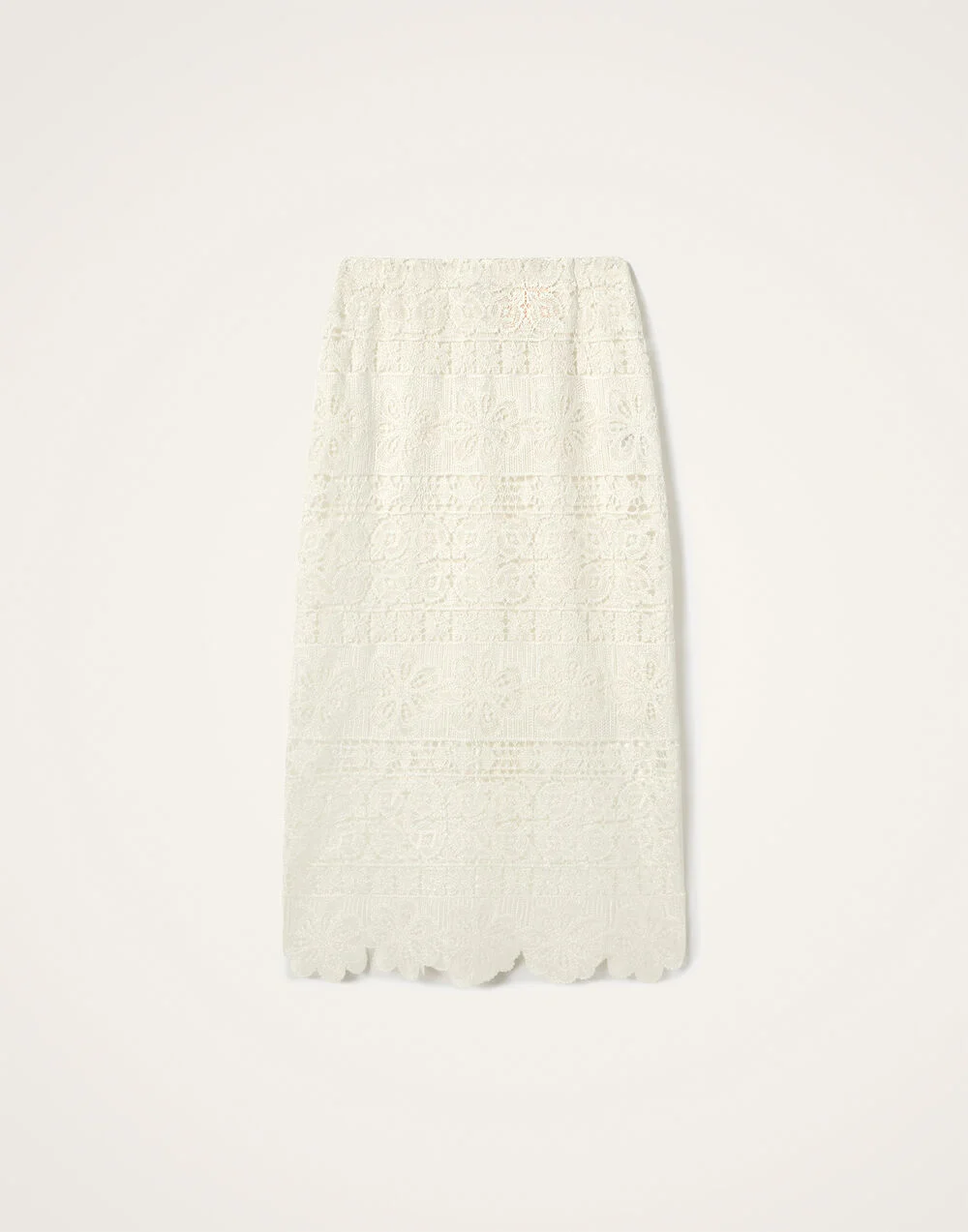 An LDJ icon, our Pencil Skirt returns in this exquisitely embroidered lace version to wow your work crowd or pull out for a special RSVP. Floral on the front, and solid on the back, she's cut in a classic column shape, sits low on the hips and has a slit at the back for easy strolling. This beautiful piece will bring joy to a crisp white shirt or styled with a figure skimming crew for office to aperitivo allure. Details & Fit - Lace - Hits approx mid-calf - Sits low on the waist - Cut with a slight A-line for ease of movement - Contrast lining - 100% Made in Italy - Composition: 100% polyester - The model is 178 cm / 5′ 10″ tall and wears a size S
