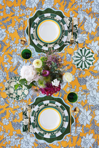 DETAILS AND INSIGHT La DoubleJ medium tablecloth in lilium/zaferano. 100% Linen Rectangular shape (180cm x 350cm) Machine wash warm (do not bleach) Made in Italy Style TBC0003-LIN001-LIL0006