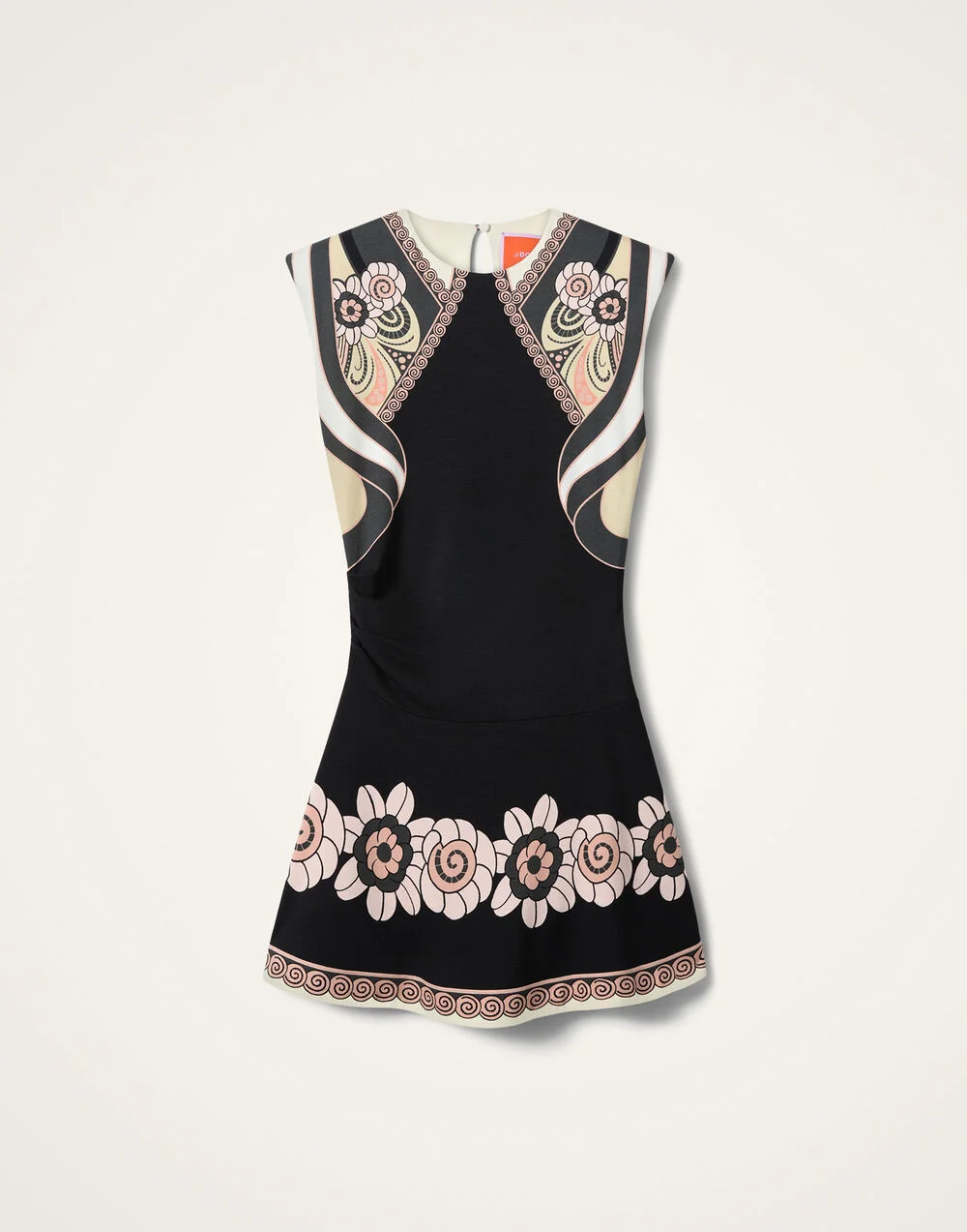 Meet the new must have mini for any badass babe. With a lightly padded shoulder, figure-skimming fit and ruche on one side of the super short skirt, the Lela Minidress makes for a striking summer silhouette. Detailed with our hand-placed Ambrosia print, this LDJ take on the LBD goes anywhere. Pair her with hi-tops for true skater-girl cool, or sandals for an August evening out look. Details & Fit - Garment fit: fitted - Interlock jersey - Ruche on one side - Slight padding in shoulders - Button at nape of neck - Zipper on side - Placed print - 94% Viscose 6% Elastane - Unlined - Made in Italy - Garment length: 80cm - The model is 177 cm / 5′ 9.7″ tall and wears a size S