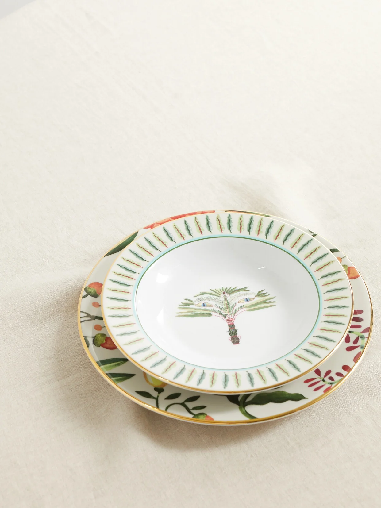 La DoubleJ's soup and dinner plate set is made in collaboration with Ancap, Italian producers of fine porcelain since 1964. Artfully finished with gold plating, each piece is boldly patterned with nature-inspired illustrations. They're dishwasher safe, too.