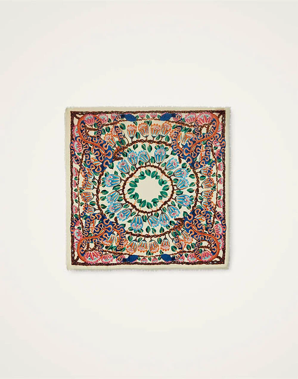 It wouldn't be dolce vita meets bohemia without a fabulously fashion forward foulard now would it? The ultimate Italian accessory for any It girl, this piece is the oldest trick in the Milanese Sciura style book, always stashed in a handbag to be folded around the hair, wrapped loosely into a crisp shirt collar, or tied onto a wrist, or ponytail. Take a cue from Estelle Pigault or Chiara Totire - who crafted this capsule with us - and tie this cashmere blend stunner loosely around the neck or bag strap for instant "Parisienne-in-Puglia" cool. Details & Fit - Modal and Cashmere blend - Estelle and Chiara "Eden" capsule - Frayed fringe edge - Placed print - Composition: 90% Modal 10% Cashmere - Made in Italy - Measures 120 x 120cm