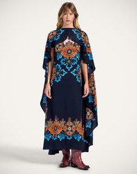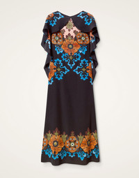 We all need a little more magic in our lives, don’t we? While this dramatically decadent dress won’t literally give you Houdini-level powers but she will draw oohs and aahs from the crowd. A sleeveless, column dress silhouette with a glorious cape down the shoulders (with a contrast print inside, no less) this mamma has red carpet royalty written all over it. Details & Fit - Crepe de Chine - Sleeveless column form - Cape with contrast print inside - Floorlength - No pockets - 100% Made in Italy - Composition: 100% silk crepe de chine - The model is 180 cm / 5′ 11″ tall and wears a size S