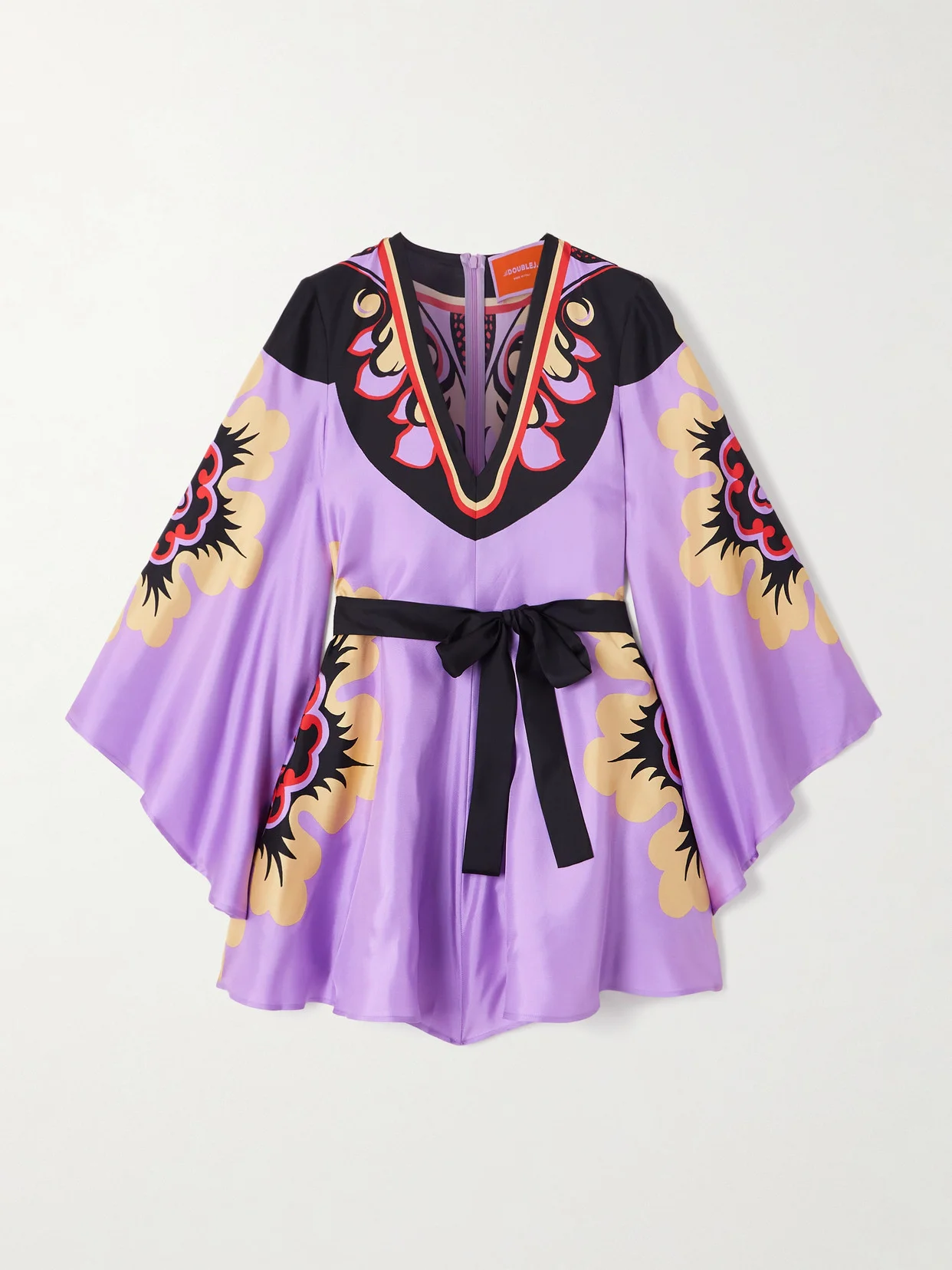 La DoubleJ's 'Icon Magnifico' dress embodies the brand's more-is-more aesthetic. Made from fluid silk-twill printed with graphic swirls, it has voluminous bell sleeves, a floaty mini skirt and belted waist.