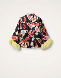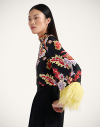If a top could be a tease, this one would be it. Deceptively demure in the front with a high neck and easy A-line shape through the body, it’s the back of this beauty that truly wows, with a cape-like high-low back that floats as you turn. This silk twill iteration with feather-dipped sleeves has date night drama written all over it. Throw it under a gilet or our Folk Jacket for bohemian flare, or with our Milano Skirt for a super chic silhouette. Details & Fit - Silk - Feathers on the sleeves - High neck - A-line shape body - Shorter in front, longer in the back - 100% Made in Italy - Composition: 98% Silk 2% Ostrich Feathers - The model is 180 cm / 5′ 11″ tall and wears a size S
