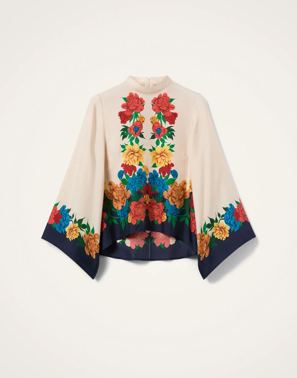 If a top could be a tease, this one would be it. Deceptively demure in the front with a high neck and easy A-line shape through the body, it’s the back of this beauty that truly wows, with a cape-like high-low back that floats as you turn. Finished in this abundant, hand-placed Peony print, it is truly designed to raise your vibration as you hop between your most special occasions this season. Double the mood-boost with the silk Palazzos to match. Details & Fit - Garment fit: regular - Silk twill - Ostrich feathers trim - Placed print - High neck - A-line shape body - Shorter in front, longer in the back - 98% Silk 2% Ostrich feathers - Unlined - Made in Italy - The model is 178 cm / 5′ 10″ tall and wears a size S