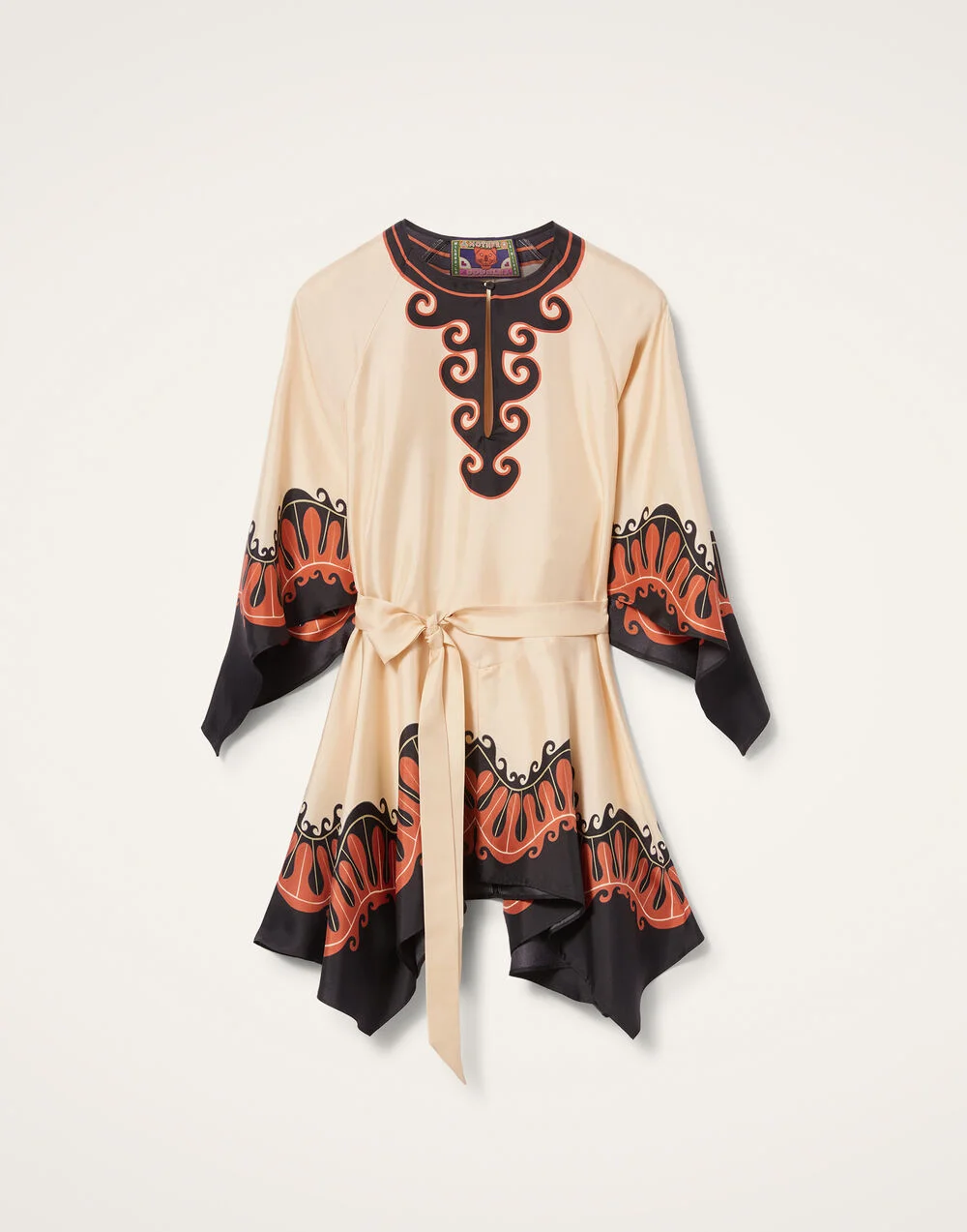This dress might be the perfect encapsulation of our collaboration with L.A.-based design brand, Mother, with its easy-breezy California cool-kid energy, and maximalist Milanese romance. Crafted from the silk twill crafted on Lake Como featuring a print perfectly positioned by Italian artisans, it’s luxurious but also laid-back, with an irregular scarf-style hem and hidden pockets for utilitarian ease. She can be worn a multitude of ways - as a tunic top over pants, loose with bare legs, or belted for a super chic, hourglass shape. Details & Fit - LDJ x Mother Collection - Silk dress - Hits mid calf - Scarf-style sleeve - Pockets - Irregular hem - Made in Italy - Composition: 100% silk - The model is 180 cm / 5′ 11″ tall and wears a size S