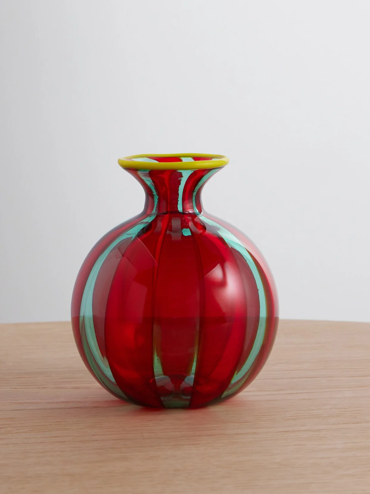 La DoubleJ's 'Mini Ciccio' vase has been hand-blown by artisans in Venice from Murano glass, a tradition that stretches back to the 13th century. It's detailed with unique ridges and patterned with a vibrant stripe that will energize all kinds of living spaces.