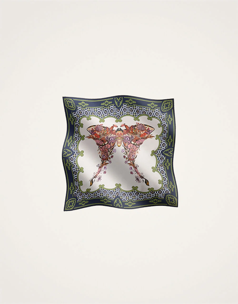 Give your outfit some Dolce Vita vibes with our 100% Made in Italy Foulard. The silk square is the oldest trick in the Milanese Sciura style book, always stashed in a handbag to be folded around the hair, wrapped loosely into a crisp shirt collar, or tied onto a wrist, ponytail or bag strap. Crafted from the finest silk twill from Lake Como, this smaller version makes a great pocket or collar companion and arrives in our stunning Mariposa print. However you decide to style yours, do as the Italians do and wear it with sunglasses. Details & Fit - Silk Twill - Square foulard - Placed print - Composition: 100% Silk - Made in Italy - Measures 45 x 45cm