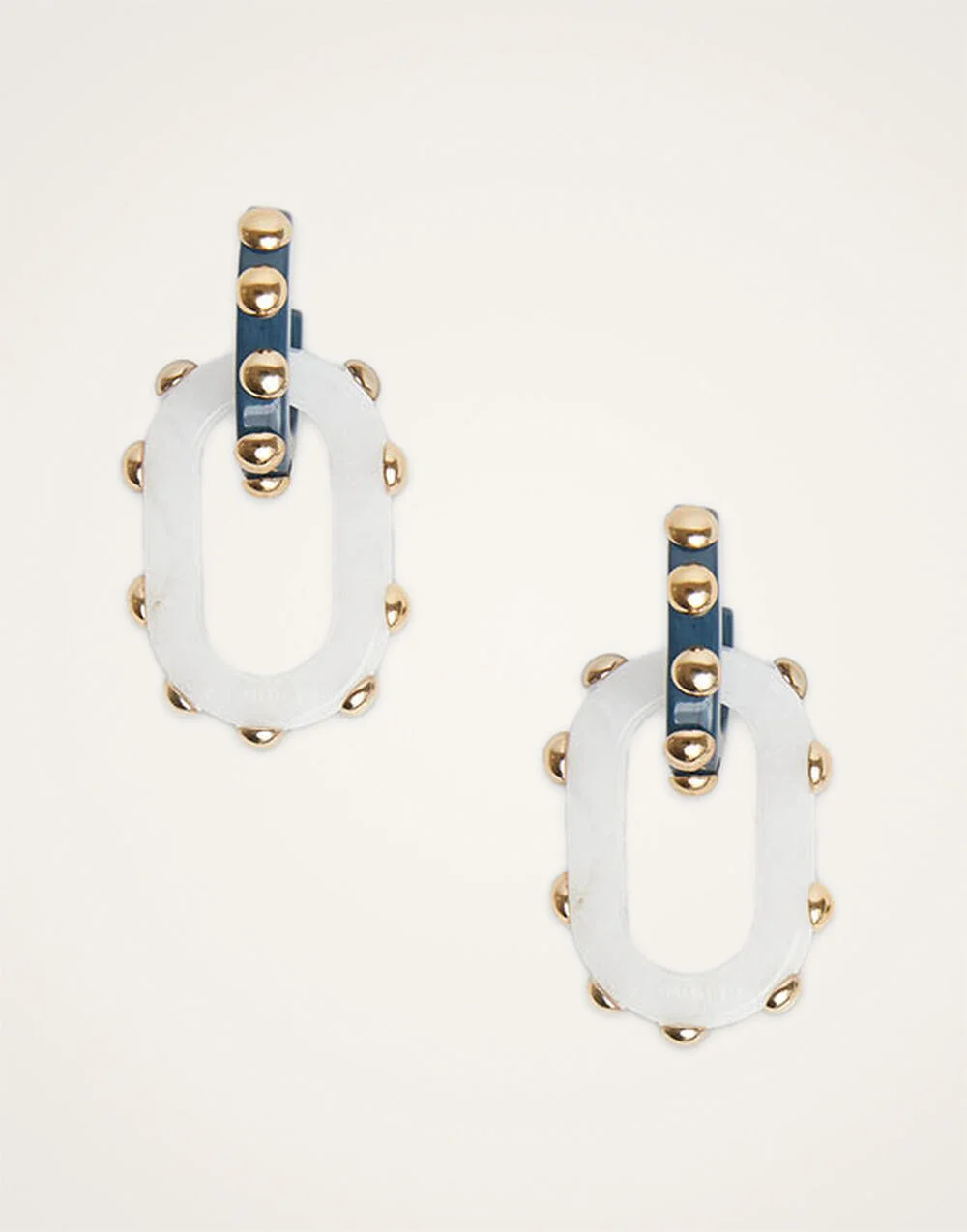 We doubled up the decadence with these gorgeous statement earrings, crafting not one but two interlocking contrast colored resin hoops studded with golden orbs along the outer edge. Inspired by the goddess of fertility, Nefertiti, these stunners beam with divine feminine energy - wear them with an elevated tee for an elevated everyday look, or go full goddess and wear them with our Nefertiti dress. Don't throw these around, amore - these delicate delights are precious. Details & Fit - Interlocking hoops - Contrast colored resin - Gold studs along hoop exterior - Brass lever back - Butterfly Closure - Composition: 85% Resin 15% Metal - Made in Italy