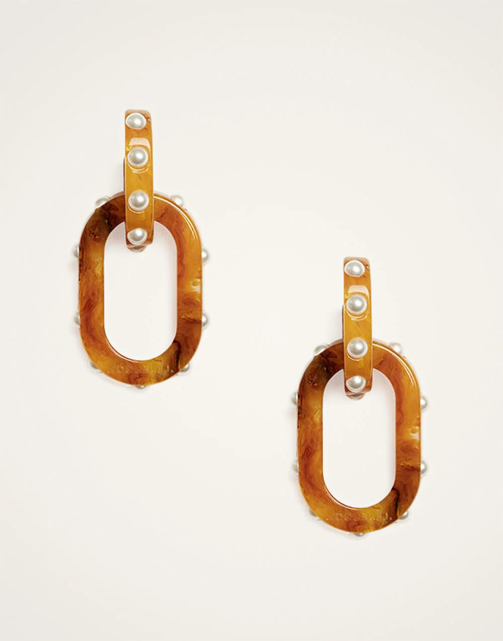 We leant into opulence when crafting these beauties, embellishing these interlocking resin hoops with pearl studs for some Renaissance-era romance. Wear them with a tee and jeans for an elevated day look, or with your new Diva Dress for something a little more dramatic. Don’t throw these around, amore - these delicate delights are precious. Details & Fit - Interlocking hoops - Contrast colored resin - Pearl studs along hoop exterior - Brass lever back - Butterfly Closure - Composition: 85% Resin 15% Metal - Made in Italy