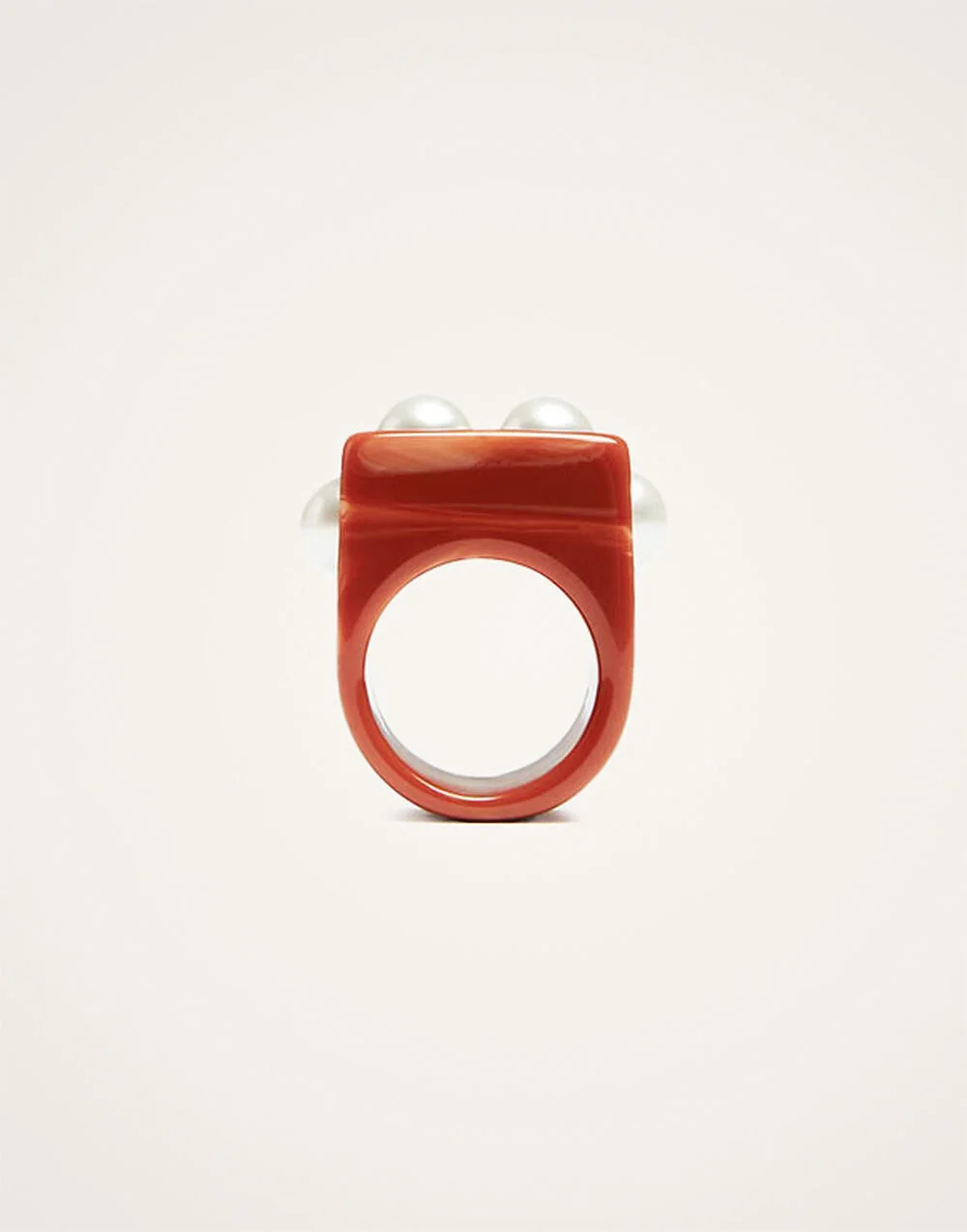 An iconic symbol of beauty and feminine power, we couldn’t think of a more fitting inspiration than the ancient Egyptian goddess Nefertiti when designing this statement jewelry piece. Crafted from solid colored resin, this oversized ring features gold studs across its rectangular band, which catch the light with every elaborate Italian gesture. Don't throw these around, amore - these delicate delights are precious. Details & Fit - Chunky rectangular ring - Colored resin with pearl studs - Size "S" 17mm diameter - Size "M" 19mm diameter - Composition: 90% Resin, 10% Zamak - Made in Italy