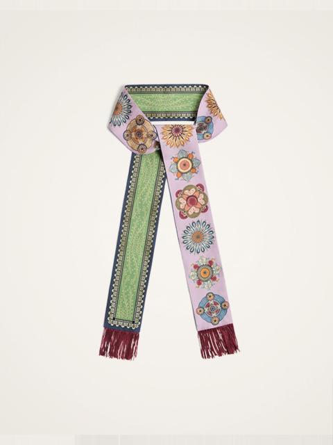 Our scarf obsession has reached new heights with this gloriously chic 100% silk number. Delivered in our energy-elevating Nucleus print inspired by the magical matter that resides within all living things, this can be worn a variety of ways - as a necktie, as a scarf, as a headband….even as a chicissima tie around a handbag. Details & Fit - Silk Twill - Slim scarf with fringes - Hand-placed print - Composition: 100% Silk - Made in Italy - Measures 8 x 150cm
