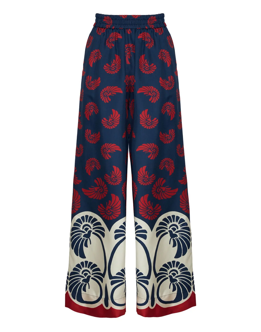 We cannot take credit for inventing the Palazzo Pant silhouette, but we will take credit for making them cool again. These trousers sit on the waist and fall flared, with a wide, breezy fit through the legs – like a skirt, but with the comfort of pants. They're made in our fluid silk twill from Lake Como and arrive in our exuberant Palmetto print, which perfectly pairs with the matching silk Foulard Shirt for parading around your next Palermo palazzo party, natch. Details & Fit - Silk twill - Elastic waist - Placed print - Concealed side pockets - Roomy fit - 100% Made in Italy - Composition: 100% Silk - The model is 178 cm tall and wears a size S