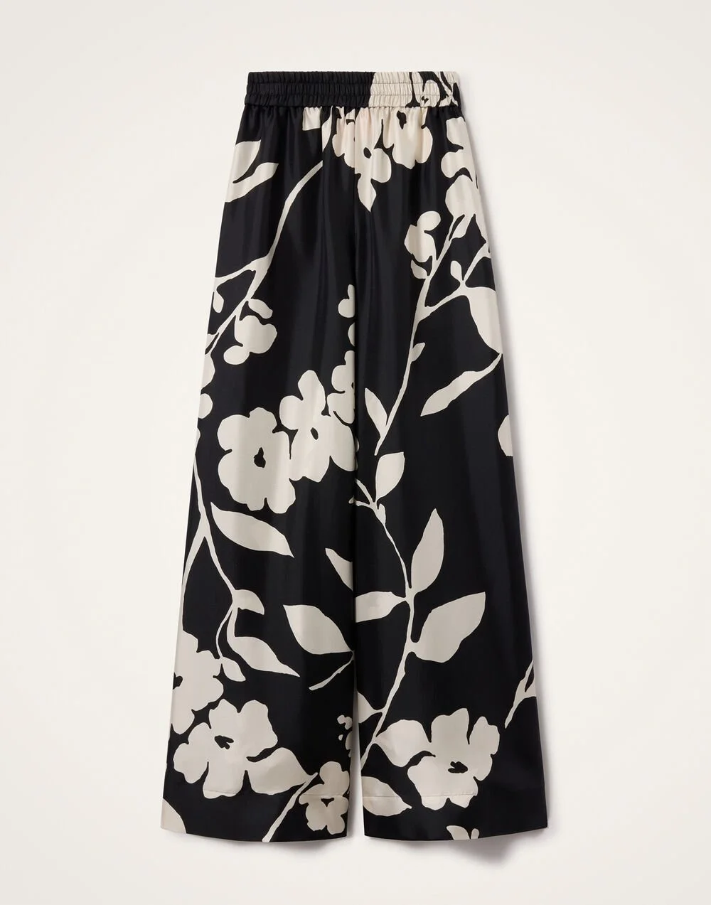 We cannot take credit for inventing the Palazzo Pant silhouette, but we will take credit for making them cool again. These trousers sit on the waist and fall flared, with a wide, breezy fit through the legs – like a skirt, but with the comfort of pants. Crafted in our woven silk twill from the shoes of Lake Como, this pair arrives in a romantic Winter Jasmine print which looks extra stunning when styled with the matching Foulard Shirt. Details & Fit - Silk twill - Elastic waist - Concealed side pockets - Roomy fit - Garment length: 110cm - 100% Made in Italy - Composition: 100% Silk