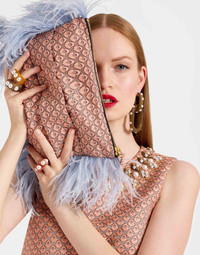 Didn't think our pochettes could get more perfect? Think again. We took this best-selling baguette with her sleek subtle side handle, crafted in Italian Jacquard and dipped her with feathers for even more fabulousness. The perfect size for your phone, your iPad, your wallet, and any extra phone numbers you'll no doubt pick up at the party. Details & Fit - Jacquard with feathers - Side handle - Zipper - Measurement: 32cm x 23cm - 100% Made in Italy - Composition: 76%Polyester 24%Polyamide