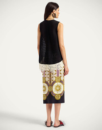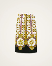 An LDJ icon, our Pencil Skirt returns in our fluttery satin to wow your work crowd or pull out for a special RSVP. Cut in a classic column shape, it sits low on the hips with a slit at the back for easy strolling. Light, unstructured and totally stunning in this hand-placed Pagoda print, it’s a god-send for suitcases and snappy RSVPs alike. Details & Fit - Satin - Hand-placed print - Hits approx mid-calf - Sits low on the waist - Slight cut with a slight A-line for ease of movement - Garment length: 75cm - 100% Made in Italy - Composition: 96% Viscose 4% Elastane - The model is 178 cm / 5′ 10″ tall and wears a size S