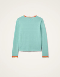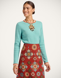 We love putting Italian spins on wardrobe staples so we’ve taken a classic crew neck and woven it in a sumptuous cashmere blend and added intricate embroidered picket detail acros its trim blend. Slim through the chest and shoulders and wide along the base to create an hourglass shape, this is a super flattering weekday workhorse, fabulous alone but extra elegant under a Jones Jacket. Details & Fit - Cashmere blend crew neck - Picket detail across trim - Made in Italy - Composition: 83% Wool 12% Cashmere 5% Cotton - The model is 176 cm / 5′ 9″ tall and wears a size S