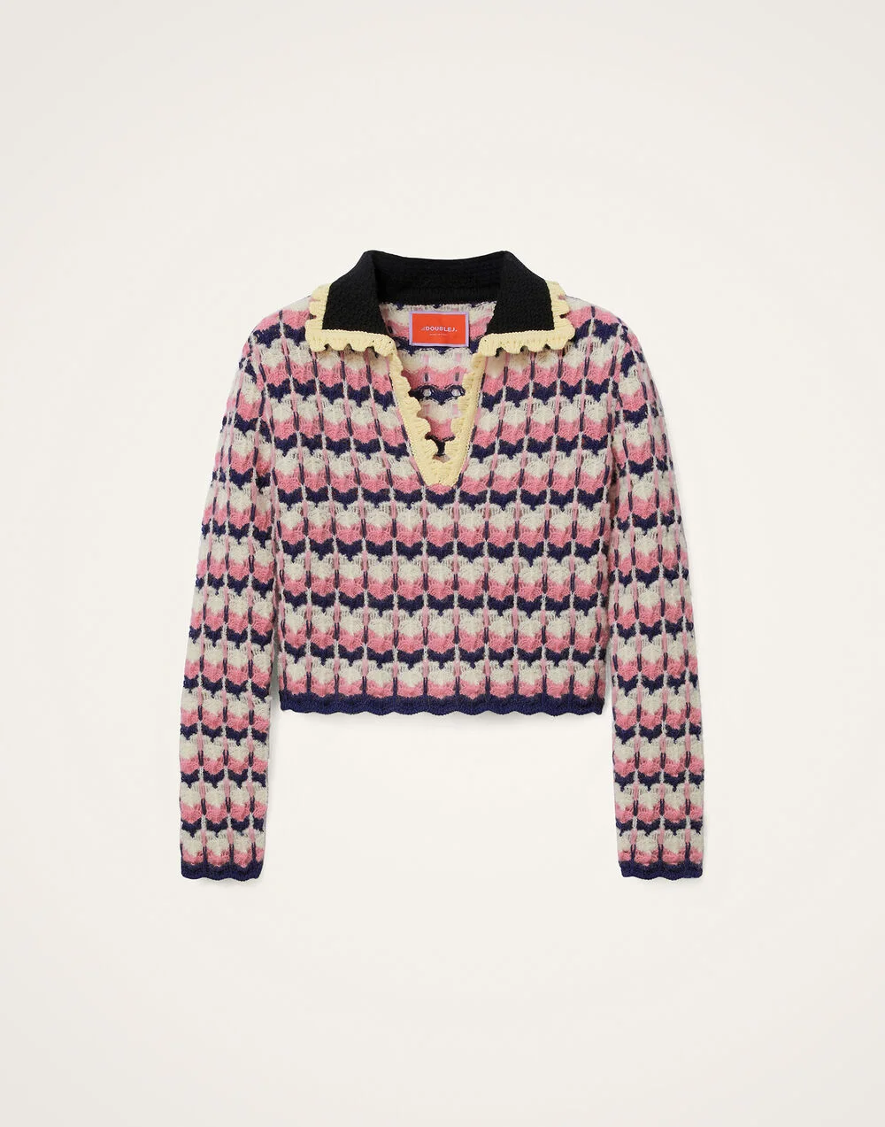 No ones to stick with the "standard" we even put our DoubleJ pizzaz into a classic polo shirt (we can't help ourselves, sorry not sorry). Delivered in a delicious alpaca-mohair blend, this multicolor must have has an intricate picket detail across the collars and cuff and is the perfect amplifier to any outfit no matter the moment. Details & Fit - Long sleeve top - Polo collar - Picket detail along collar and cuff - 100% Made in Italy - Composition: 57% Wool 15% Polyamide 15% Mohair Wool 8% Alpaca Wool 5% Silk - The model is 176 cm / 5′ 9″ tall and wears a size S