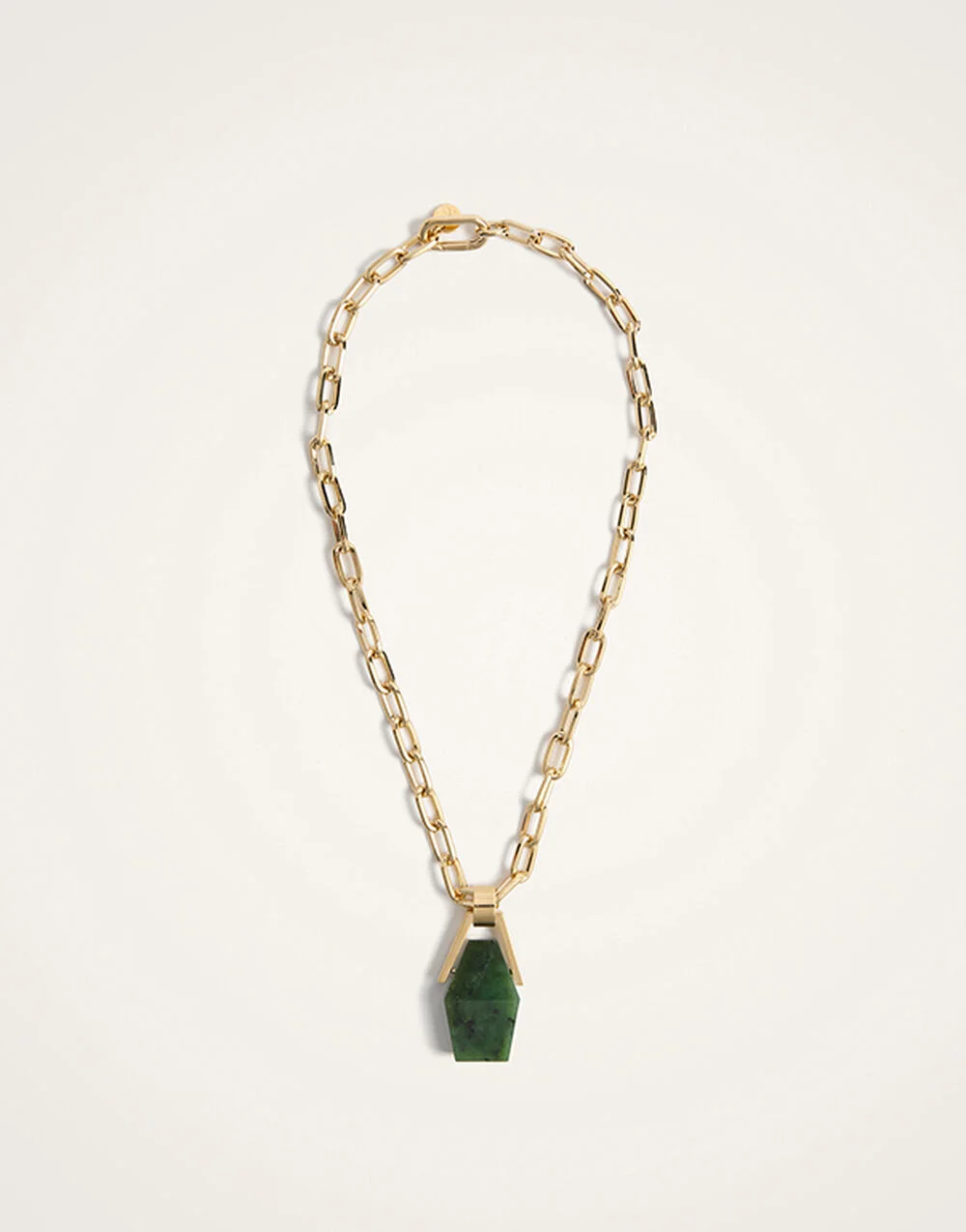 Featuring a slice of jade - a stone that symbolizes abundance and longevity - we like to think of this pendant as a little joy portal to your soul, sitting over your heart. Layer it up with necklaces from your own collection or leave it solo for more of a statement. Take care of these, amore - these pendants are precious. Details & Fit - 24k Gold plated brass and green jade - Portal Pendant necklace - 70% Brass 30% Jade - Made in Italy - Adjustable Chunky Chain is 55cm