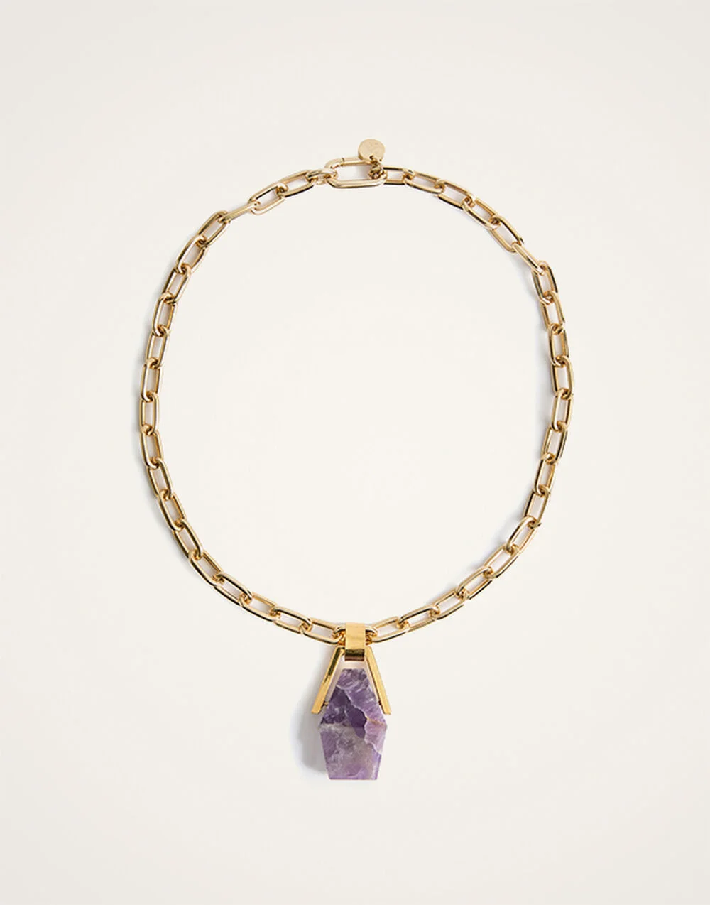 Delivered in precious Amethyst - a powerful stone associated with the Crown Chakra that aids in cultivating a connection with the Divine - we like to think of this pendant as a little joy portal to your soul, sitting ver your heart. Layer it up with necklaces from your own collection or leave it solo for more of a statement. Take care of these, amore. These pendants are precious. The portal is your entry point to higher states of consciousness, so these designs are reminders of that, intended to keep you connected to your higher consciousness. Details & Fit - Portal Pendant necklace - 24K Gold Plated Brass and Amethyst - Adjustable Chunky Chain is 55cm - 70% Brass 30% Amethyst - Made in Italy
