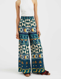 We cannot take credit for inventing the Palazzo Pant silhouette, but we will take credit for making them cool again. These trousers sit on the waist and fall flared, with a wide, breezy fit through the legs – like a skirt, but with the comfort of pants. Let our tiled Casareale print evoke Portofino summers - wear them over the matching Sexy swimsuit for your morning ocean plunge. Details & Fit - Silk twill - Elastic waist - Concealed side pockets - Roomy fit - 100% Made in Italy - Composition: 100% Silk - The model is 180 cm tall and wears a size S - Garment length: 110cm