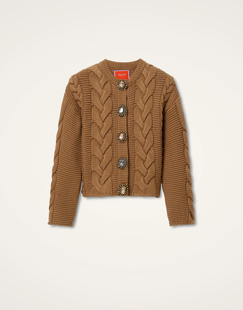 A chunky cropped cardigan crafted from a cashmere blend? Sign us up, sister. With thick braids down the front and sleeves, this extra special statement piece will have you aching for sweater weather even in high summer. Yes, those are extra large gemstones running from top to bottom. In this molto Milanese shade of brown, say hello to Italian opulence. Details & Fit - Cropped cardigan - Chunky knit braids - Gem embellishments - 100% Made in Italy - Composition: 40% Merino Wool 25% Viscose 25% Nylon 10% Cashmere - The model is 178 cm / 5′ 10″ tall and wears a size S