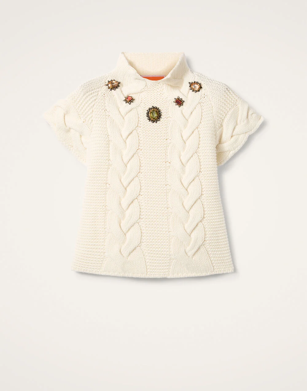 Just like our Portrait Sweater, this knit kit essential has chic, chunky braids down the front and across the shoulder, but this time with short sleeves and a romantic high neck. Small slits at the side hem give her a more waisted effect. Adorable with jeans or over our La Favorita slip dress. Details & Fit - Form fitting knit top - Short sleeve - Chunky braids down front and on shoulder - 100% made in Italy - Composition: 10%Cashmere 40%Merino Wool 25%Viscose 25%Nylon