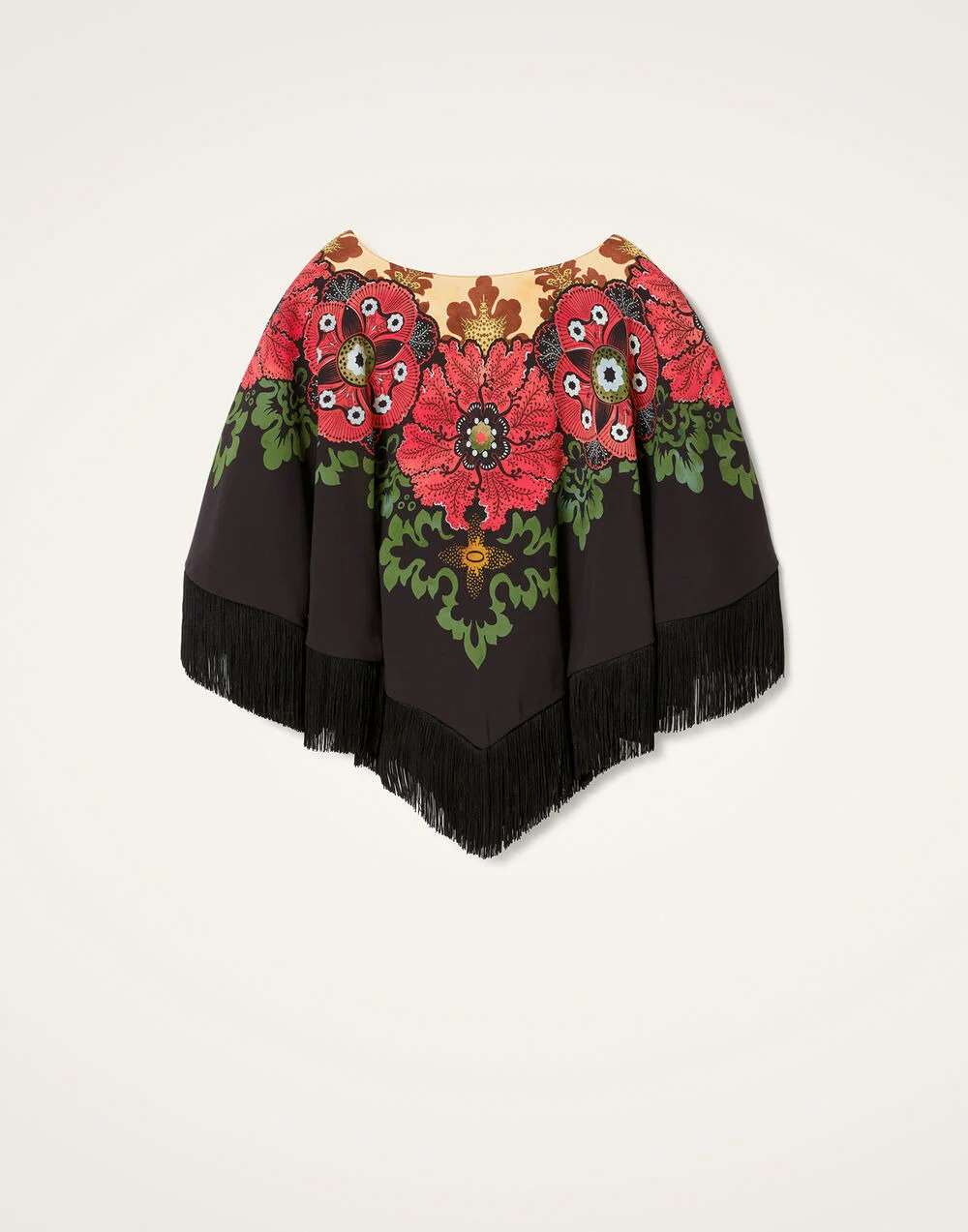Who says a poncho can't be "piccolo"? Delivered in this sleek Italian satin with a touch of stretch, the Mini Poncho arrives in our hand-placed prints with fringes all along the hem for extra flourish. An easy everyday outfit upgrader you can also lip it over a silk dress at a wedding when the sun goes down for extra wow. Details & Fit - Envers Satin - Mini Poncho with Fringes - Reversible - Placed print - Composition: 96% Viscosa 4% Elastane - Made in Italy