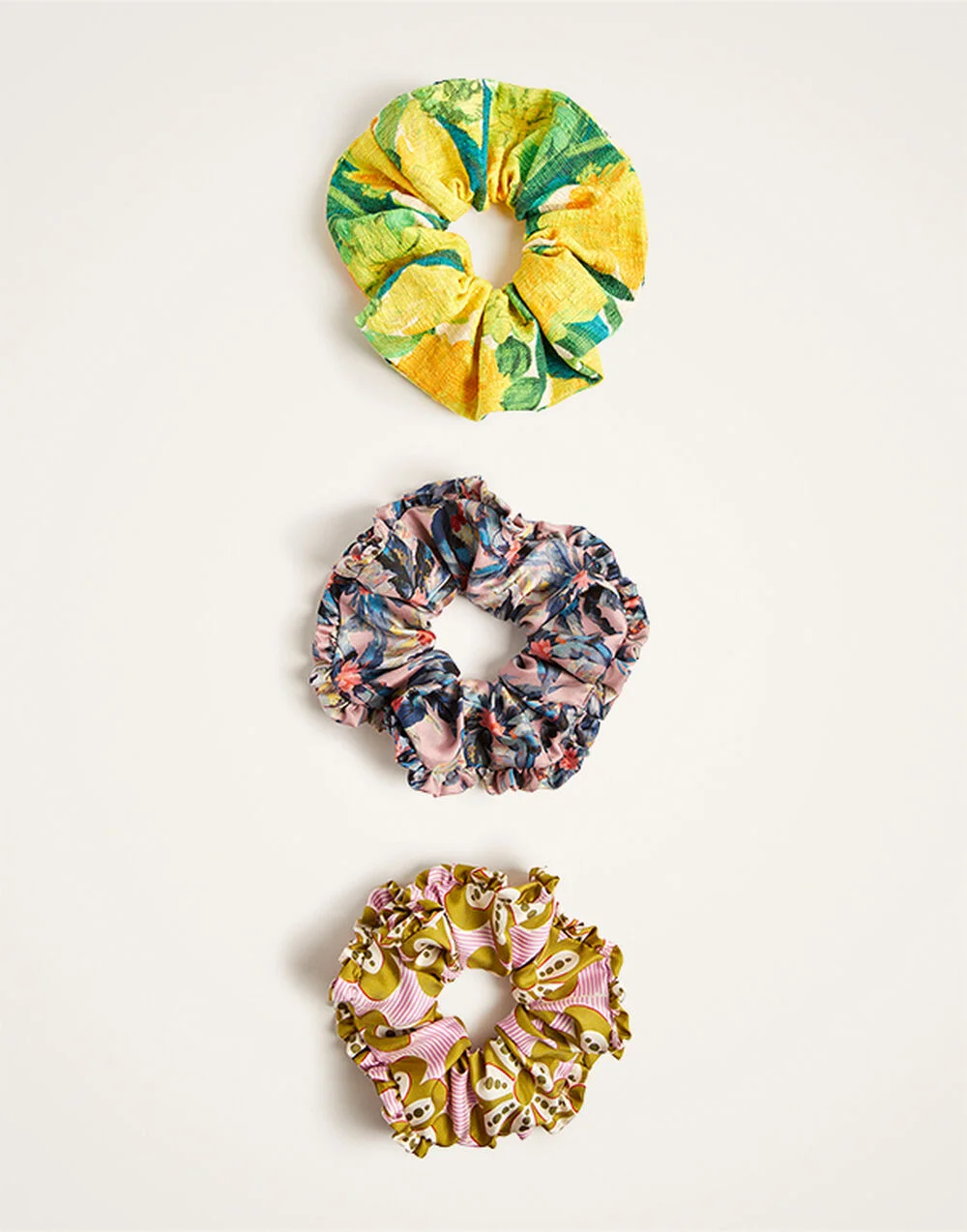 Not sure which of our fabulously oversized printed scrunchies to select? Not to worry - we've delivered a mixed set of these maximalist beauties to ensure your set for high-vibe hairstyles for the season. Details & Fit - Mixed set of scrunchies - Extra large design - Elasticated - 100% Made In Italy - Composition: 66% Silk 33% Cotton 1% Elastane