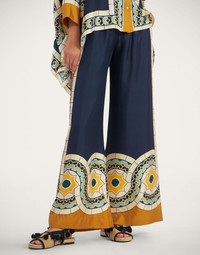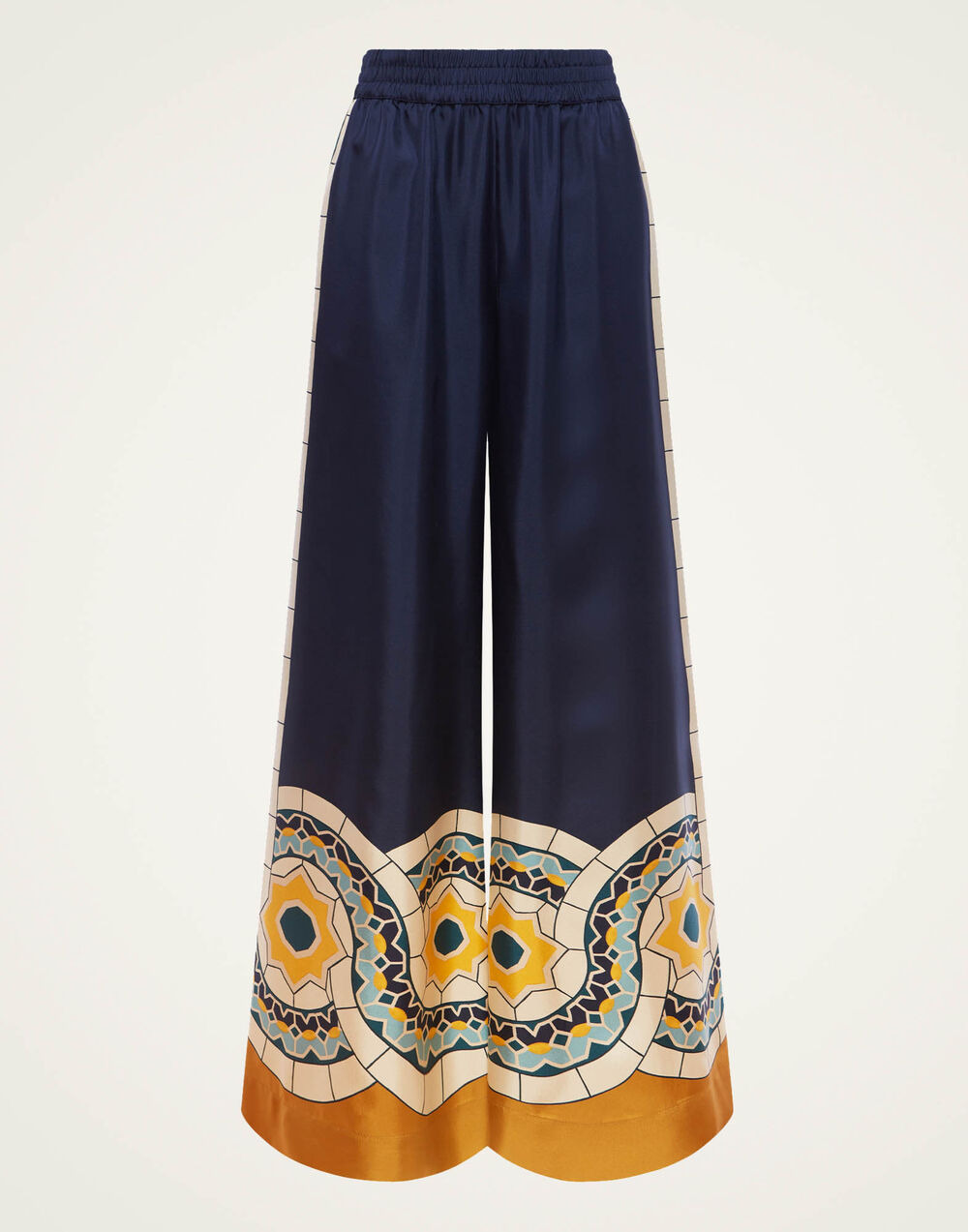 We cannot take credit for inventing the Palazzo Pant silhouette, but we will take credit for making them cool again. These trousers sit on the waist and fall flared, with a wide, breezy fit through the legs – like a skirt, but with the comfort of pants. Cut in our iconic silk twill from Lake Como, they arrive in this hyper sophisticated hand-placed Mudejar print that will glide you between all spring’s occasions with a chic shot of confidence and ease. Details & Fit - Silk twill - Hand-placed print - Elastic waist - Placed print - Concealed side pockets - Roomy fit - 100% Made in Italy - Composition: 100% Silk - The model is 179 cm tall and wears a size S - Garment length: 106cm