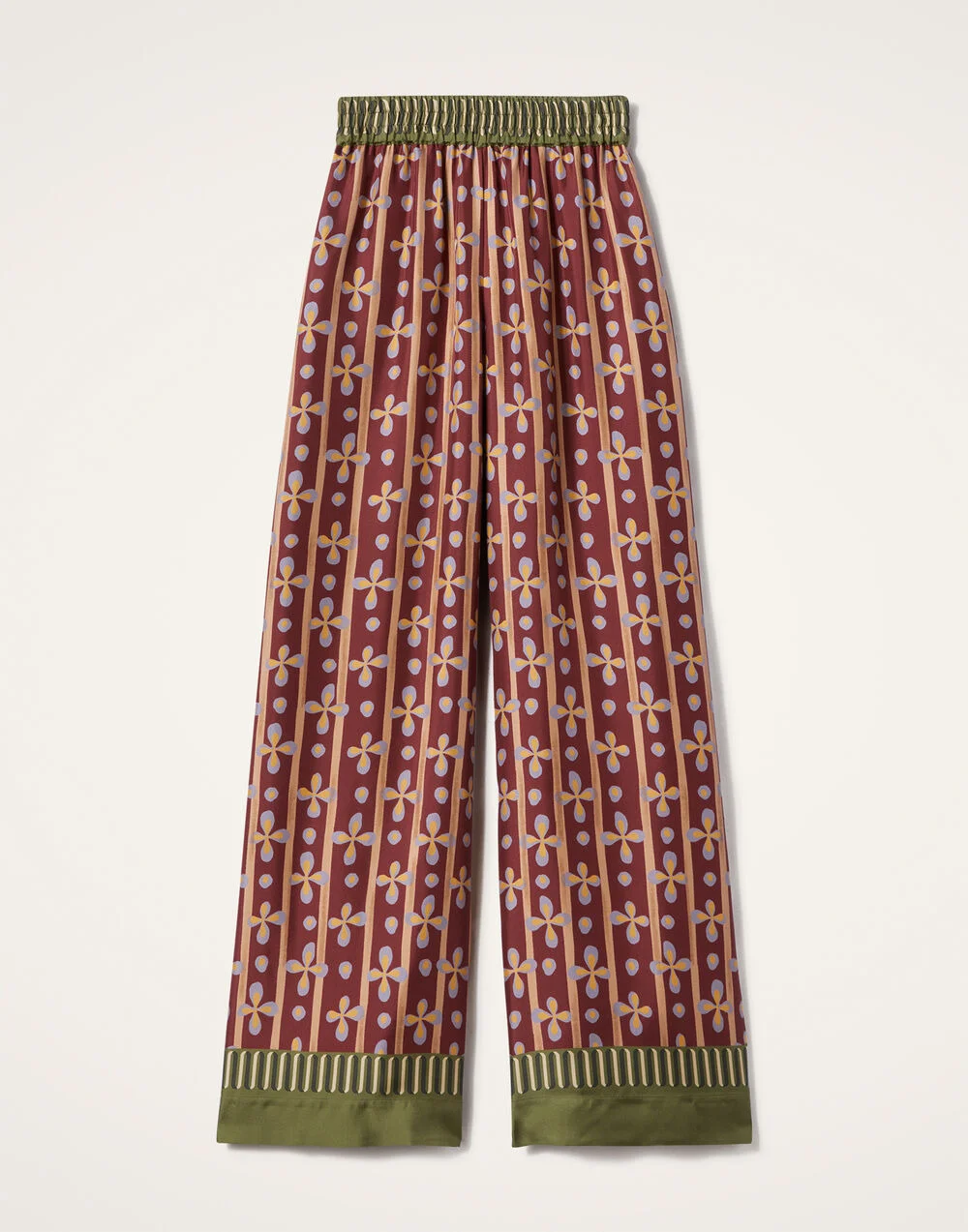 We cannot take credit for inventing the Palazzo Pant silhouette, but we will take credit for making them cool again. These trousers sit on the waist and fall flared, with a wide, breezy fit through the legs – like a skirt, but with the comfort of pants. With a woven texture and a lustrous hint of shine, they're made in our fluid silk twill from Lake Como and arrive in this stunning print expertly placed by hand. Details & Fit - Silk twill from Lake Como - Elasticated waist - Concealed side pockets - Wide cut - 100% Made in Italy - Composition: 100% Silk - Garment length: 106cm - The model is 177 cm / 5′ 9.7″ tall and wears a size S