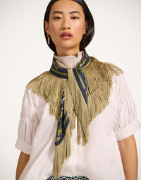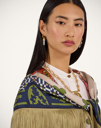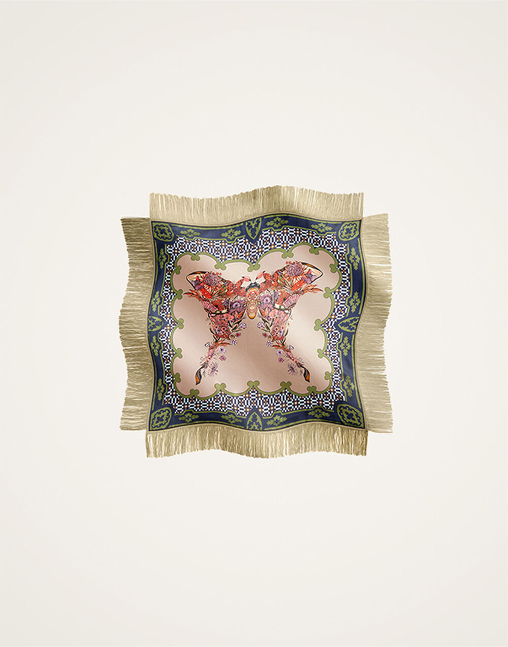 We took the classic silk scarf (an Italian essential no mater the season) and added fringes for extra opulent flair. Delivered in our stunning hand-placed prints, this elevated accessory looks as gorgeous draped over the shoulders as it does worn as a headscarf. Details & Fit - Silk Twill - Square foulard with fringes - Reversible - Placed print - Composition: 100% silk - Made in Italy - Measures 90 x 90 cm