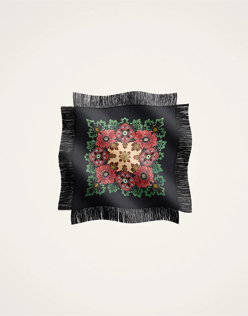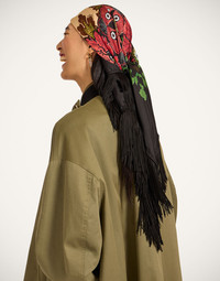 We took the classic silk scarf (an Italian essential no mater the season) and added fringes for extra opulent flair. Delivered in our stunning hand-placed prints, this elevated accessory looks as gorgeous draped over the shoulders as it does worn as a headscarf. Details & Fit - Silk Twill - Square foulard with fringes - Reversible - Placed print - Composition: 100% silk - Made in Italy - Measures 90 x 90 cm